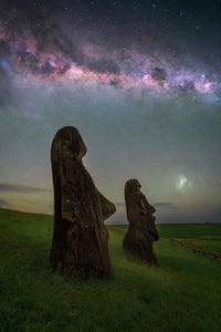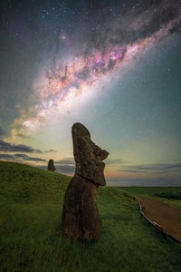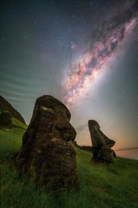 As the Moai statues are very dark, you need a longer shutter speed to be able to capture them in full detail. These photos are a blend (without moving the tripod) of two shots. The first shot is 90 seconds long, f/3.5, ISO 3200. I always close the aperture a bit for the foreground in order to get a better depth of field and reduce the need for complex focus stacking. The sky is a single shot for these images - 20 seconds, ISO 2000, f/2.0. I usually take more images for the sky and stack them, but at Rano Raraku we only had an hour and half for shooting - and I wanted to take all compositions possible with many different Moai, rather than waste time stacking. I used a sturdy tripod, as well as a remote shutter (in order to get the 90-second exposure).