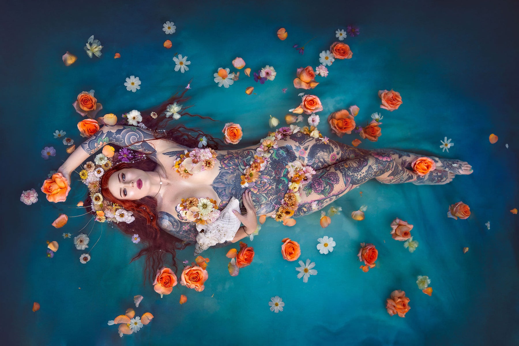 The idea for this shoot came from Haley Smith, a professional underwater model, mermaid, and designer. She had the vision to re-imagine Botticelli’s iconic “Birth of Venus”... but make it underwater. Kimber and Haley have worked together on workshops, television shows and more – so they sat down and made a plan to recruit other women-owned businesses to bring the shoot to life! Haley and her partner Mike built the 6-foot tall seashell out of items from Lowes, Kimber and her team handled the photography/videography, Ashley Rodriguez of Garden & Grace Florals covered the shell in stunning flowers, Talia of Petunia’s Florals created wearable florals and a stunning headpiece. Additionally, they brought in a woman-owned cosmetics company (Body Color Cosmetics) who designed custom waterproof shimmer lotion, used Baby Dream Backdrops, sourced most of the flowers from a local woman-owned flower farm, and Tattered Pixie designed the jellyfish skirt.