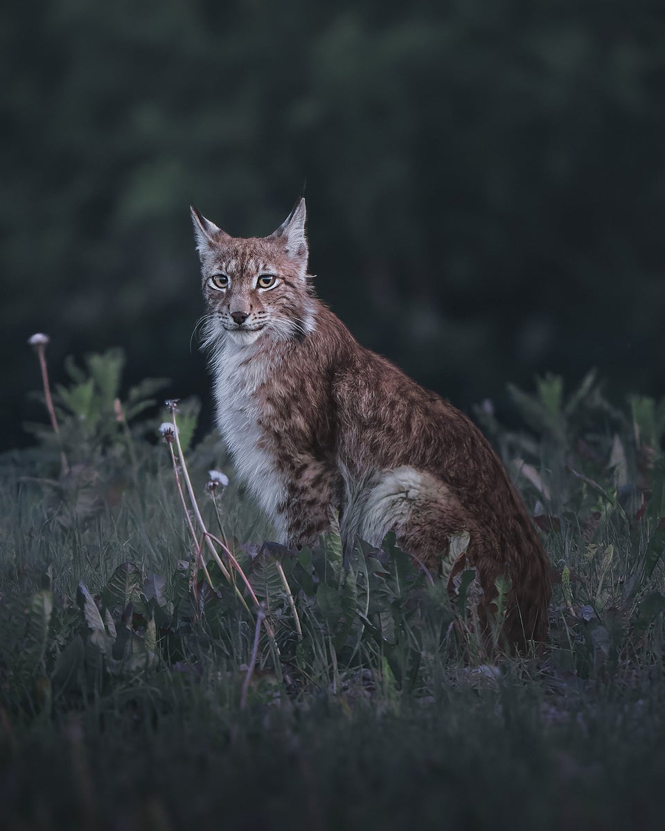 The first photo was taken at 22:56, and the last one at 00:42, giving me a generous couple of hours of shooting time with this elusive lynx. In Finland, during summertime, the northern parts of the country experience the phenomenon of the midnight sun, where the sun doesn't set for several weeks. Even in the southern parts where I live, there are a few hours of dim light during the night. This provides opportunities for photography and videography. Most of the time, the lynx was lying on the ground, but occasionally it would get up. What a magnificent animal it was!