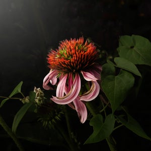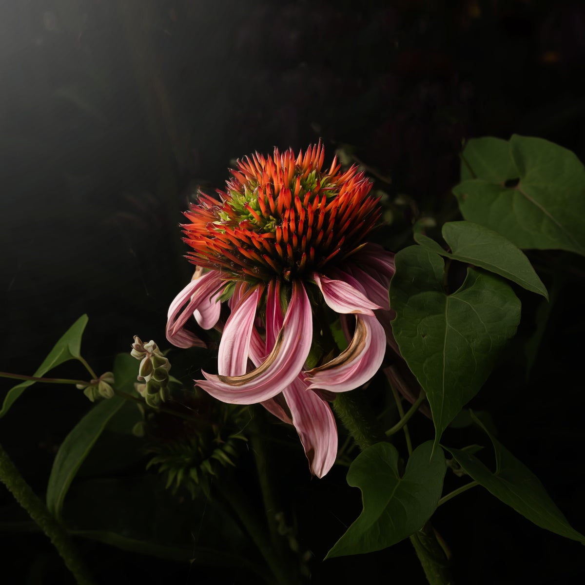 “This image is more than meets the eye. The cone flower, otherwise known as echinacea, is so representative of resiliency. It symbolized so many things that matter to me. This particular one was all twisted and growing funny, and yet the bees and butterflies were there, waiting for me to get out of the way. Echinacea, like this one, provides natural medicine, known for helping with colds. In spite of its cosmetic defects, it survives harsh winters, and in death, feeds the birds with its seeds. Even in death it provides shelter for overwintering insects. I love how flawed it is and yet that adds to its unique beauty.”