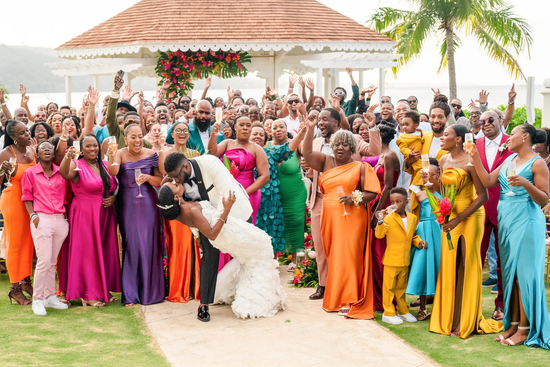 “This was captured right after the bride and groom's ceremony exit. This was a destination wedding in Montego Bay, Jamaica. Their guests, each and every one a close friend or family member of the couple, were all still seated behind them so it was the perfect opportunity to capture a candid portrait of everyone together. I stood on a chair and asked everyone to stand up and cheer for the couple.”