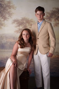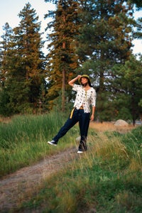 “I captured this photo of the model (Ally) using natural light and a small reflector on the side to bring light to the face and eyes. We had these beautiful pines silhouetted as a backdrop and the benefit of a large opening with great footing so we could add some movement to the wardrobe.”